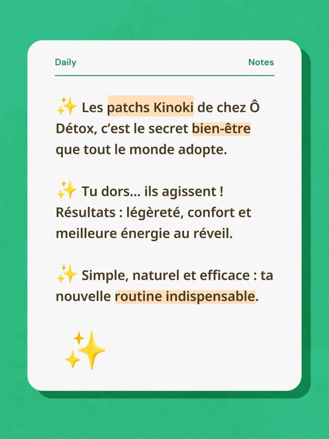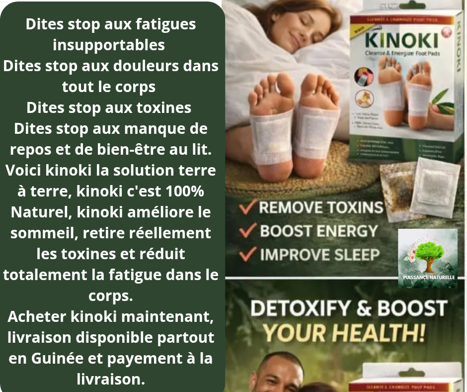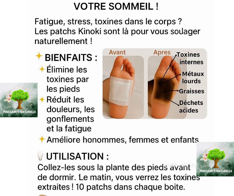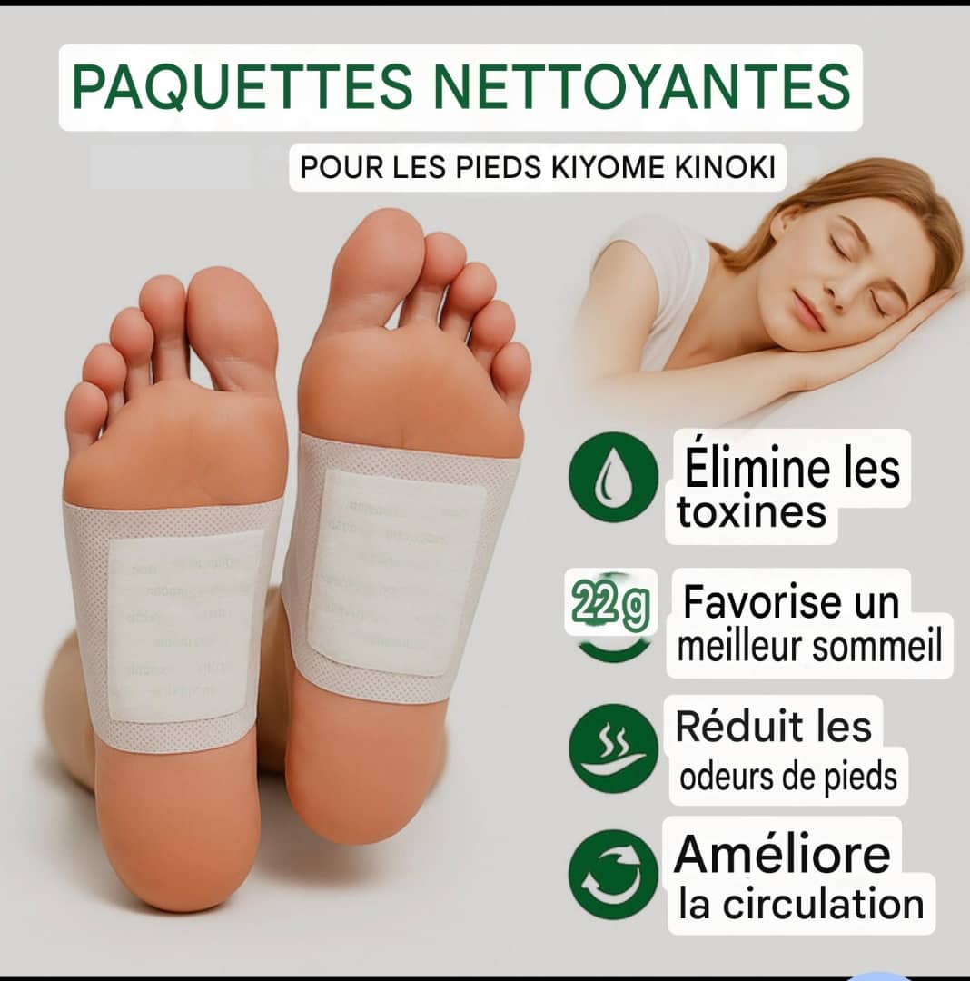 Les coussinets Kinoki sont conçus pour être appliqués sur les pieds pendant la nuit. Ils aident à éliminer les toxines, améliorer la circulation sanguine, et revitaliser le corps. En plus de favoriser un meilleur sommeil, ces coussinets boostent également l'énergie en purifiant le système pendant le repos, pour un réveil plus frais et revitalisé.